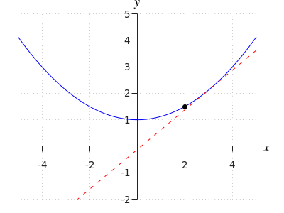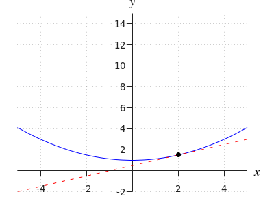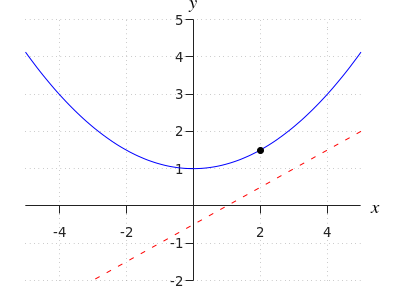 Hieronder zie je vier afbeeldingen van de grafiek #f(x)=\frac{1}{2} x^2+2# (blauw doorgetrokken getekend), een lijn (rood gestreept getekend), en het punt #\rv{1,{{5}\over{2}}}#. In welke afbeelding is de lijn de raaklijn aan #f# door het punt #\rv{1,{{5}\over{2}}}#?