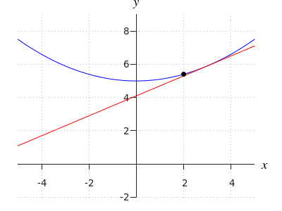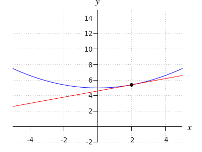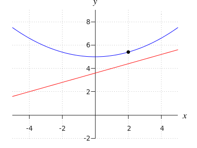 Below you see four images of the graph #f(x)=\frac{1}{4} x^2+3# (in blue) with a line (in red) through the point #\rv{1,{{13}\over{4}}}#. In which image is the line the tangent line to #f# at #\rv{1,{{13}\over{4}}}#?