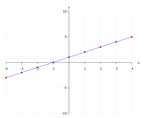 Om de grafiek te maken, tekenen we een assenstelsel. Daarna tekenen we de punten uit de tabel in het assenstelsel, want dit zijn punten van de grafiek. Daarbij komt de #x#-waarde op de horizontale as en de #y#-waarde op de verticale as. Deze punten verbinden we vervolgens met een rechte lijn. We krijgen dan de onderstaande grafiek. De punten uit de tabel zijn rood gekleurd. Merk op dat aangezien we weten dat een lineaire formule een rechte lijn als grafiek heeft het voldoende was om twee punten te bepalen.