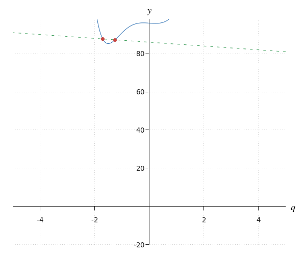 | Stap 2 | We schetsen de grafieken #y=x^{10}+6\cdot x^5+3\cdot x+19# (blauw) en #y=3\cdot x+14# (groen gestreept). ![]() |