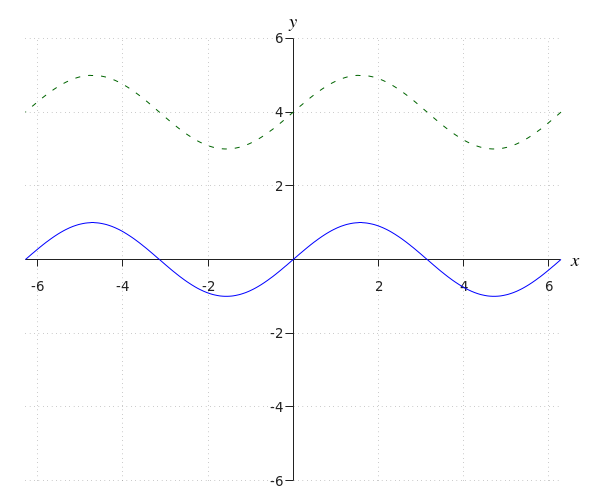 We schuiven de grafiek van #f(x)=\sin(x)# met #\green q# omhoog. De nieuwe functie wordt \[f(x)=\sin(x)+\green q\] De periode en amplitude van de functie blijven gelijk, maar de evenwichtsstand wordt gelijk aan #\green q#. |