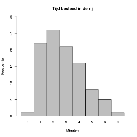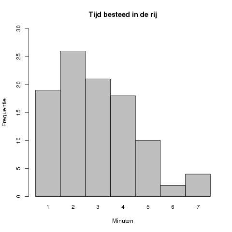 In dit geval ligt de piek van de grafiek bij #2# minuten, met een geobserveerde frequentie van #26#.