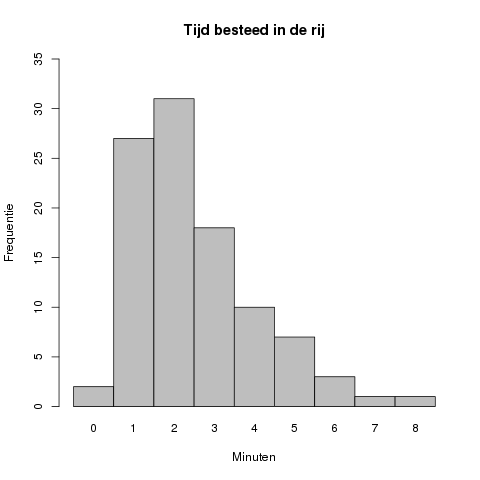 In dit geval ligt de piek van de grafiek bij #2# minuten, met een geobserveerde frequentie van #31#.