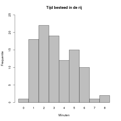 In dit geval ligt de piek van de grafiek bij #2# minuten, met een geobserveerde frequentie van #22#.
