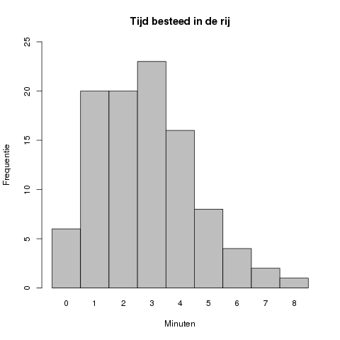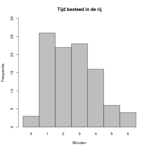 In dit geval ligt de piek van de grafiek bij #3# minuten, met een geobserveerde frequentie van #23#.