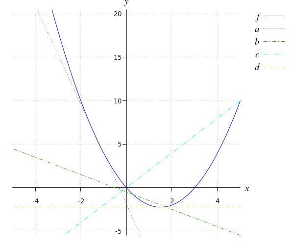 Lijn #a# is een raaklijn in #x=-1.08#: rond dat punt heeft de lijn namelijk alleen dat punt gemeenschappelijk met de grafiek, en daar ligt de lijn helemaal onder de grafiek.