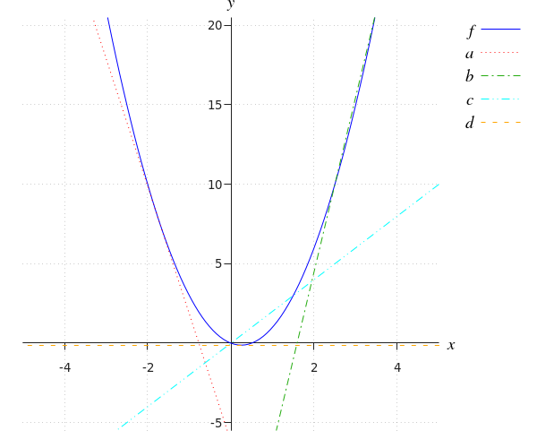 Lijn #d# is een raaklijn in #x={{1}\over{2}}#: rond dat punt heeft de lijn alleen dat punt gemeenschappelijk met de grafiek, en daar ligt de lijn volledig onder de grafiek.
