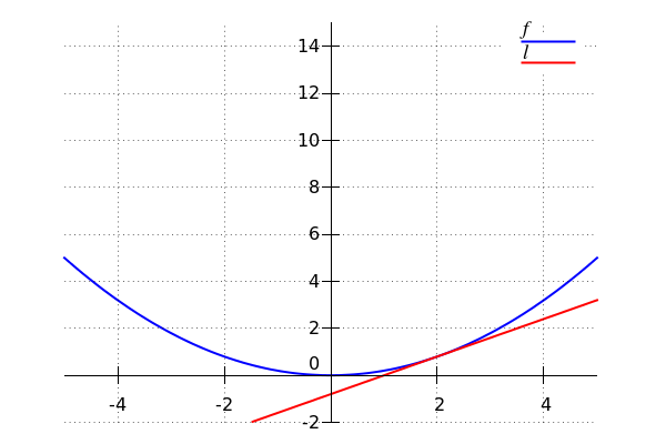 Verder is de helling #f'(a)# van #f# in #a# gelijk aan de helling van deze lijn. De lijn is dus de unieke rechte door #\rv{a,f(a)}# met helling #f'(a)#. Dit betekent dat het de raaklijn aan #f# in #a# is.