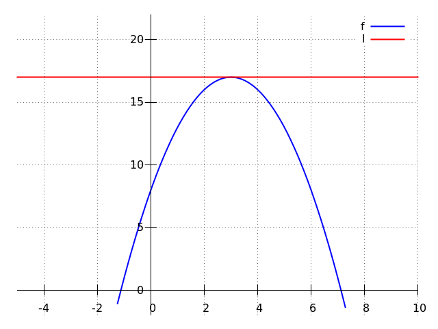 De formule van de raaklijn ziet er dan uit als: #l(x)=0 \cdot x +b#. Je hoeft nu alleen nog #b# te berekenen. Dit gaat eenvoudig. De raaklijn gaat door #\rv{1,4}#. Dus #b=4-0 \cdot 1 = 4#. Het functievoorschrift voor de raaklijn is dus #l(x)=4#.