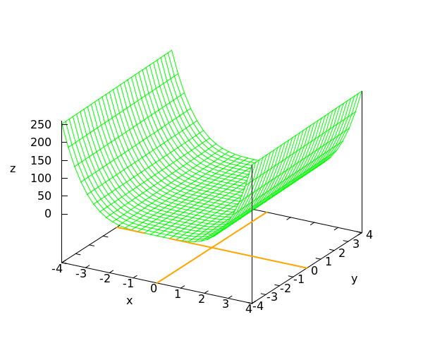 Bivariate functies kunnen worden gevisualiseerd op verschillende manieren; de meest opvallende daarvan gebruikt het concept van een grafiek. We herinneren eraan dat de grafiek van een functie \(f\) van een enkele variabele de verzameling van punten \(\rv{x,y}\) is met \(y=f(x)\) en dat de grafiek van een functie \(f\) van twee variabelen de verzameling punten \(\rv{x,y,z}\) is met \(z=f(x,y)\). Meestal is de grafiek een oppervlak in de 3-dimensionale ruimte. Hier zijn een paar begrippen die helpen om visueel inzicht in de grafiek te krijgen.