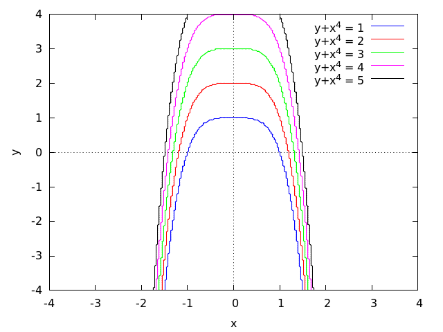 De eerste van deze is #y^4+x=1# en de laatste is #y^4+x=5#. Elke kleur vertegenwoordigt hier een andere waarde van de # c#.