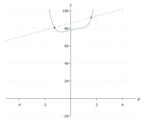 | Stap 2 | We schetsen de grafieken #y=a^{10}-2\cdot a^5-a+78# (blauw) en #y=81-a# (groen gestreept). ![]() |
