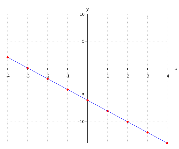 Allereerst maken we een tabel bij de grafiek. Daarvoor substitueren we de #x#-waarden in de functie. Voor #x=-4# vinden we dan #y=4\cdot \left(-4\right)+5=-11#. De andere #x#-waarden gaan op dezelfde manier en dan vinden we onderstaande tabel.
