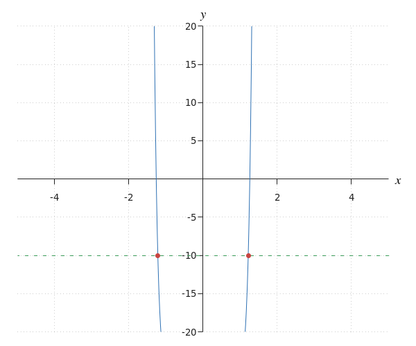 | Step 3 | We can read the solutions to the inequality from the graph. \[q\lt -4^{{{1}\over{3}}}\lor q\gt -1\] |