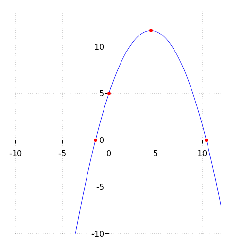 | Stap 3 | De snijpunten met de #x#-as zijn de punten waarvoor geldt #y=0#. \[\begin{array}{rcl} -{{x^2}\over{2}}-2\cdot x+7 &=& 0 \\&&\phantom{xxx}\color{blue}{\text{de op te lossen vergelijking}}\\ x=\dfrac{-{-2}-\sqrt{\left(-2\right)^2-4 \cdot -{{1}\over{2}} \cdot 7}}{2 \cdot -{{1}\over{2}}} &\vee& x=\dfrac{-{-2}+\sqrt{\left(-2\right)^2-4 \cdot -{{1}\over{2}} \cdot 7}}{2 \cdot -{{1}\over{2}}} \\&&\phantom{xxx}\color{blue}{\text{abc-formule ingevuld}}\\ x=-3\cdot \sqrt{2}-2 &\vee& x=3\cdot \sqrt{2}-2 \\&&\phantom{xxx}\color{blue}{\text{uitgerekend}}\\ \end{array}\] De coördinaten van de snijpunten met de #x#-as zijn dus: #\rv{-3\cdot \sqrt{2}-2,0}# en #\rv{3\cdot \sqrt{2}-2,0}#. Om de waarden in de grafiek te tekenen, moeten we ze afronden. Dat geeft: #\rv{-6.2,0}# en #\rv{2.2,0}#. |