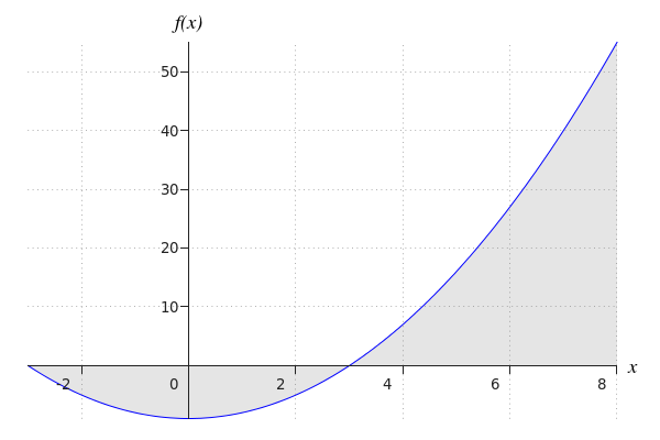 The figure below shows the graph of the function #f(x)=x^2-8\cdot x+12# drawn for #x\in\ivcc{2}{9}#. The region enclosed by the function #f# and the #x#-axis is colored grey.