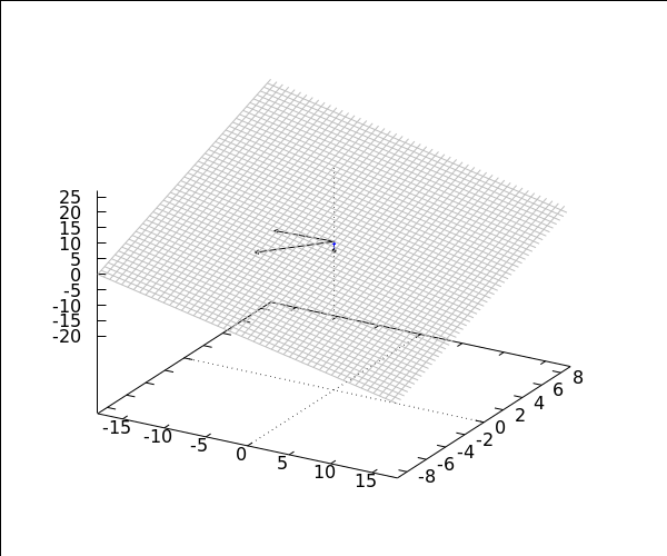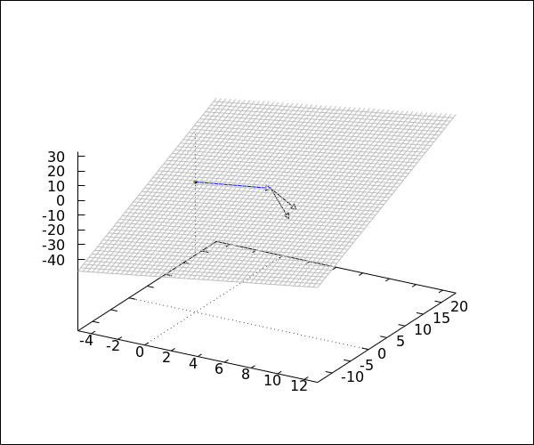 Ook vlakken in de 3-dimensionale ruimte kunnen we beschrijven met behulp van parametervoorstellingen. We kiezen weer een vaste oorsprong #\vec{0}# in de ruimte. Voor een vlak hebben we één steunvector nodig en twee richtingsvectoren en (dus) twee parameters. Om de parametervoorstelling werkelijk die van een vlak te laten zijn, mogen de twee richtingsvectoren niet op dezelfde lijn door de oorsprong liggen.