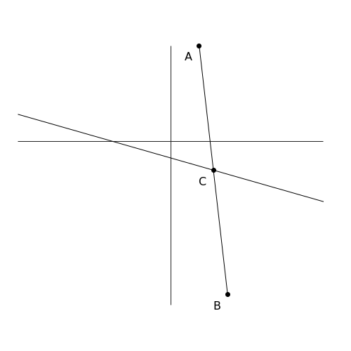 De lijn door #A# en #B# heeft parametervoorstelling #A+\lambda\cdot (B-A)#. Als we de coördinaten invullen, staat hier \[\rv{27,-5}+\lambda\cdot\rv{132-27,-50+5}=\rv{27+105\lambda,-5-45\lambda}\tiny.\] Om te onderzoeken of hier een punt van de lijn #l# gegeven door de vergelijking #7 x +3 y -54=0# in zit, vullen we deze coördinaten voor de variabelen #x# en #y# in de vergelijking in\[\begin{array}{rclcl} 7( 27+105\lambda)+3 (-5-45\lambda) -54 &=& 0 &\phantom{x}&\color{blue}{\text{coördinaten ingevuld}}\\ 120+600\lambda &=& 0 &\phantom{x}&\color{blue}{\text{vereenvoudigd}}\\ \lambda &=& -{{1}\over{5}} &\phantom{x}&\color{blue}{\text{opgelost}}\\ \end{array} \]Omdat de waarde van #\lambda# niet tussen #0# en #1# ligt, behoort het snijpunt #A-{{1}\over{5}} \cdot (B-A)# niet tot het lijnstuk #AB#. Vandaar dat het antwoord nee is. Zie de figuur hieronder.